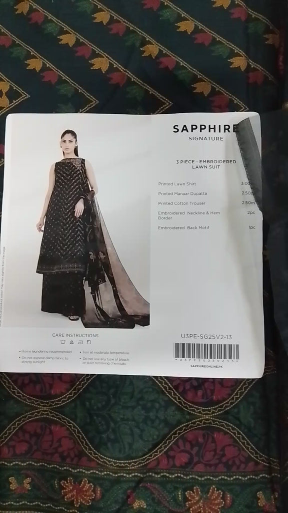 This 3-piece embroidery lawn suit from Rahwaleen’s Sapphire collection brings together a dramatic fusion of black, deep green, and maroon — perfect for women who love depth, contrast, and confident style.