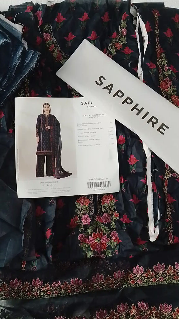 Bold yet delicate — this 3-piece embroidery lawn suit from Rahwaleen’s Sapphire collection features a stunning 🌸🖤 Midnight Bloom color palette. A rich black base is beautifully brought to life with soft pink floral embroidery and green stems, blending elegance with nature-inspired charm.