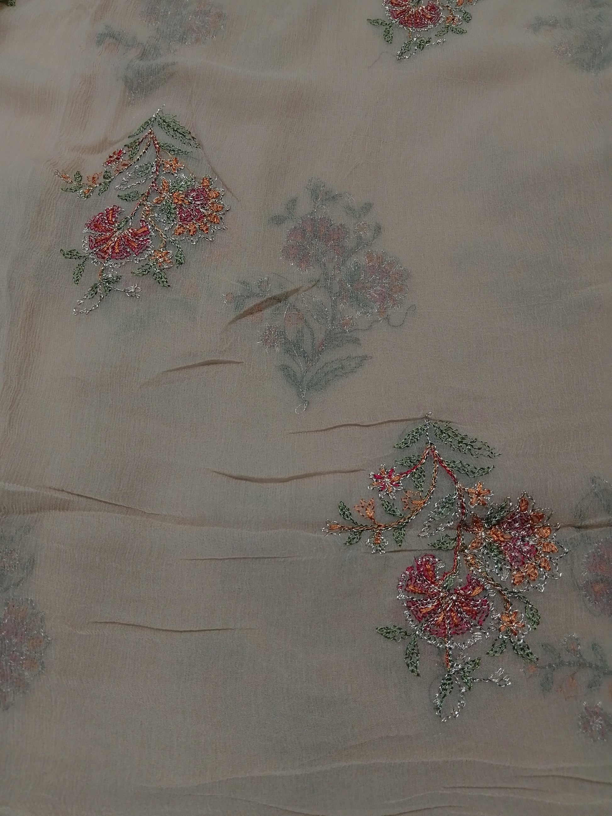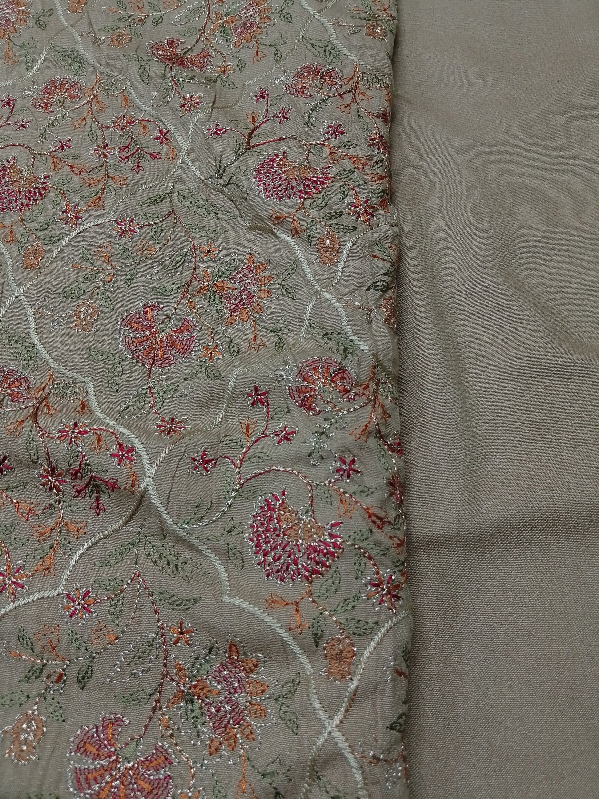 A dyed matching trouser keeps the ensemble grounded, while the lightweight crinkle chiffon dupatta completes this unstitched masterpiece with flowing elegance. Perfect for semi-formal gatherings, festive evenings, and timeless winter wear.