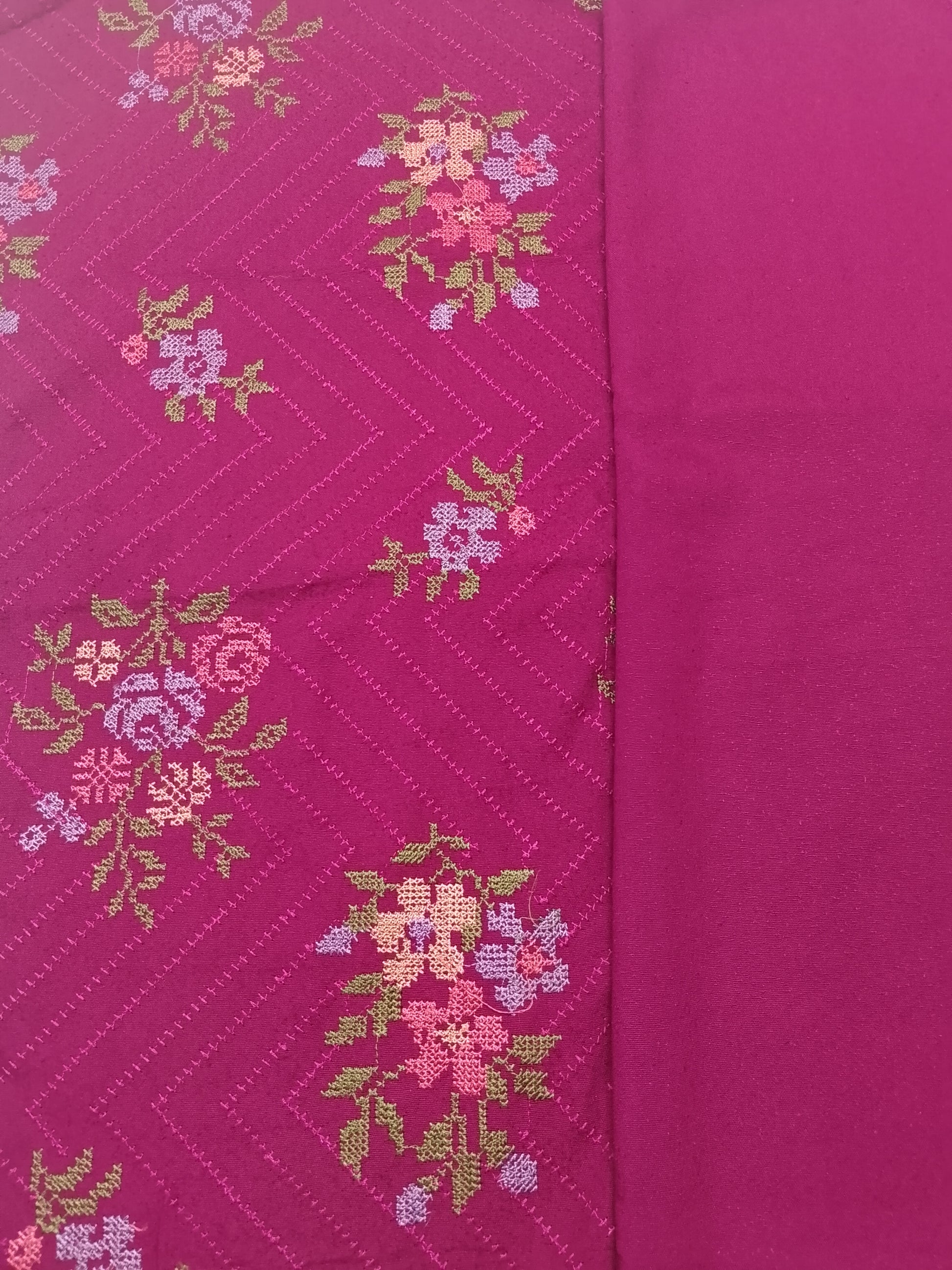 Bold, rich, and full of timeless charm — this Bareeze Karandi embroidered suit from Rahwaleen is presented in a deep 🍷 Maroon Majesty shade, beautifully adorned with multi-color cross-stitch embroidery in green, pink, and peach tones. Paired with a breezy chiffon dupatta and a matching dyed trouser, this 3-piece unstitched outfit blends sophistication with festive artistry.