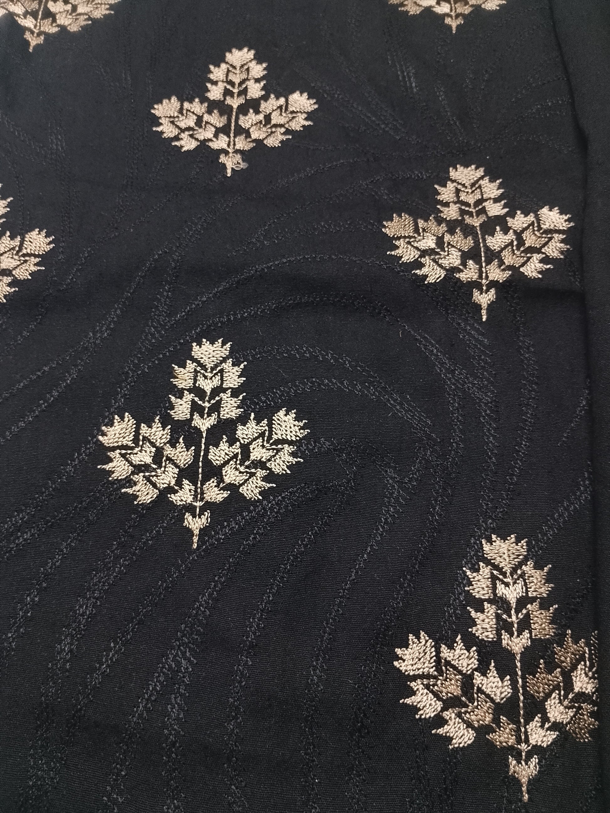 A statement of luxury and grace โ the Rahwaleen Winter Karandi Embroidered Suit shines in a classic black base enhanced with radiant golden floral embroidery outlined in black threadwork. This Bareeze design blends timeless sophistication with a modern festive glow, making it the perfect pick for winter gatherings, formal dinners, and celebratory evenings.
