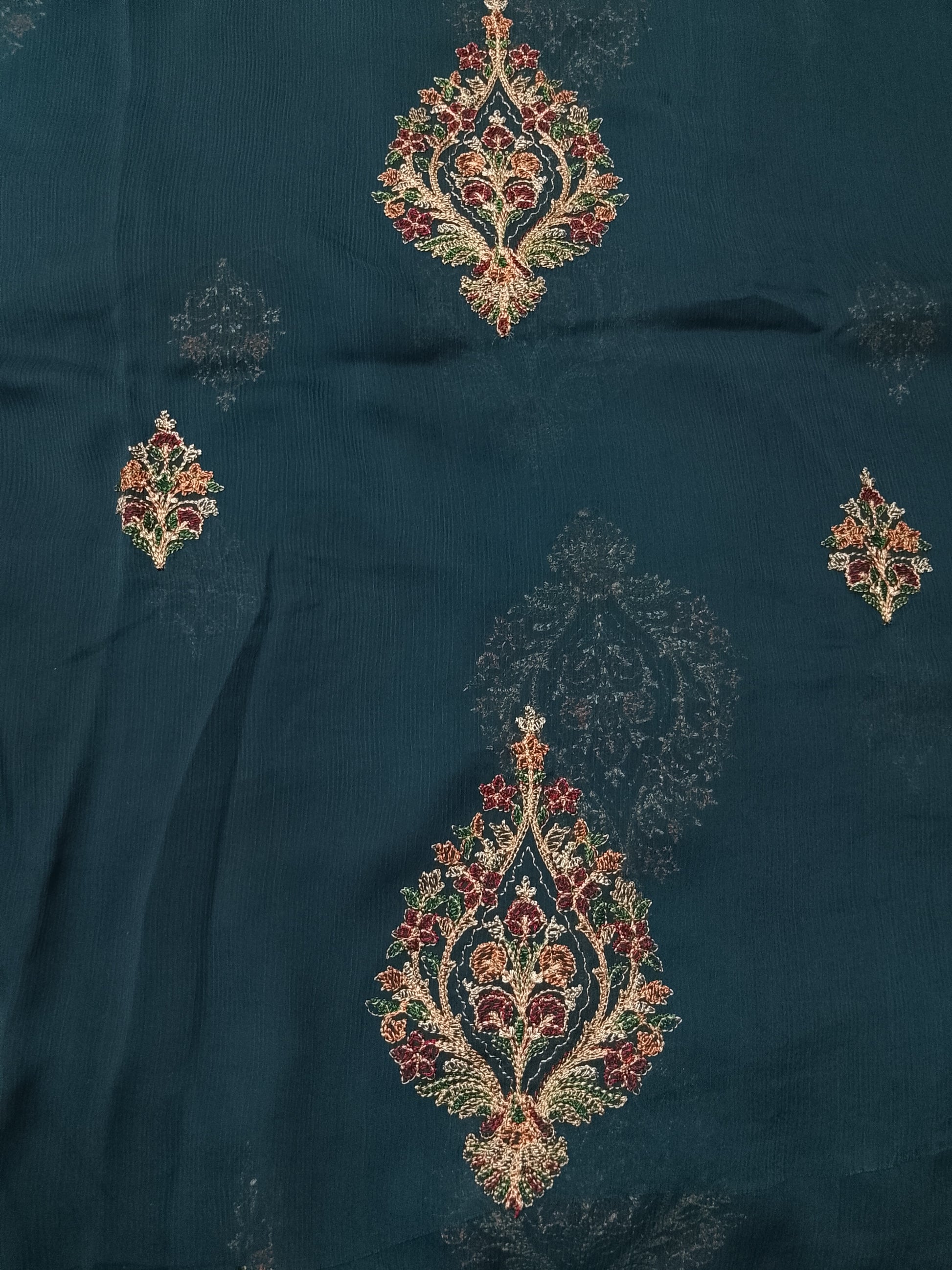 Completed with a light chiffon dupatta and a dyed trouser, this 3-piece unstitched outfit blends sophistication and versatility — perfect for winter occasions.