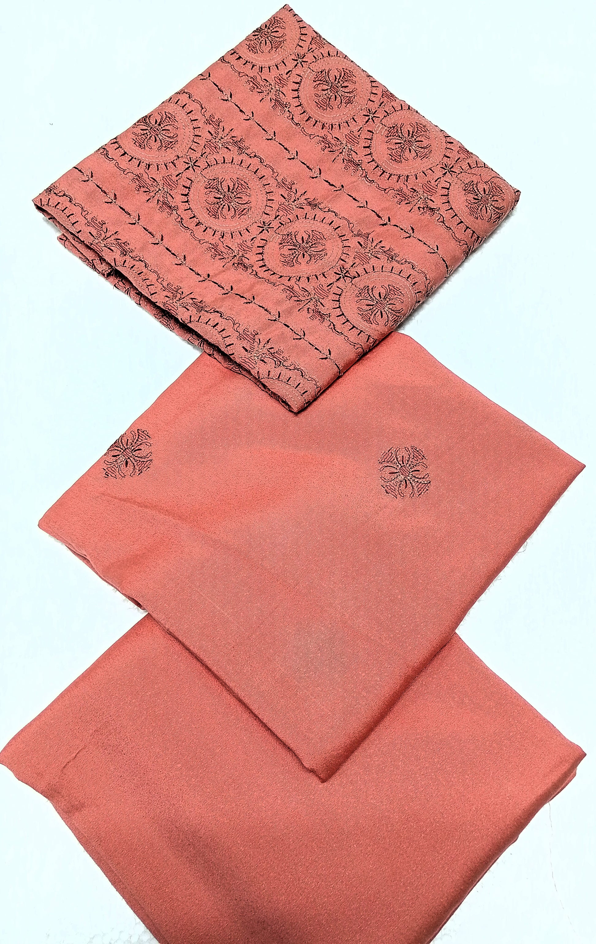 The shirt front features full floral embroidery in rich peach and maroon threads, creating a warm and vibrant contrast. The back carries delicate embroidered bootis, while a matching dyed trouser completes this timeless winter-ready look.