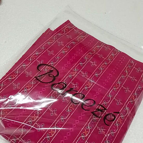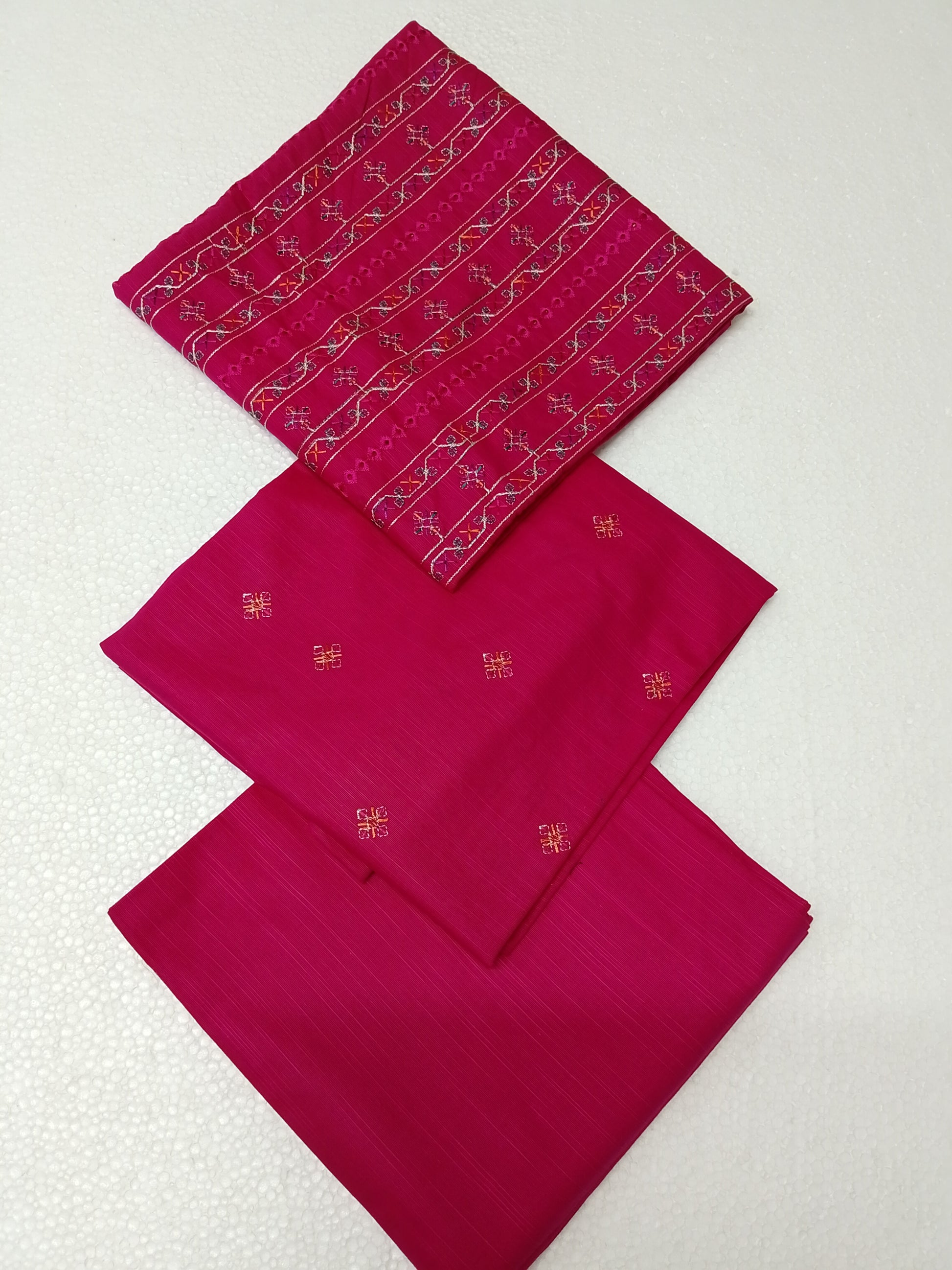 Set on a vibrant pink base, the front shirt is fully embroidered with floral patterns crafted in gold, red, and blue threads, while the back carries delicate booti embroidery for a refined finish. A dyed matching trouser completes this unstitched ensemble, offering both comfort and timeless beauty.